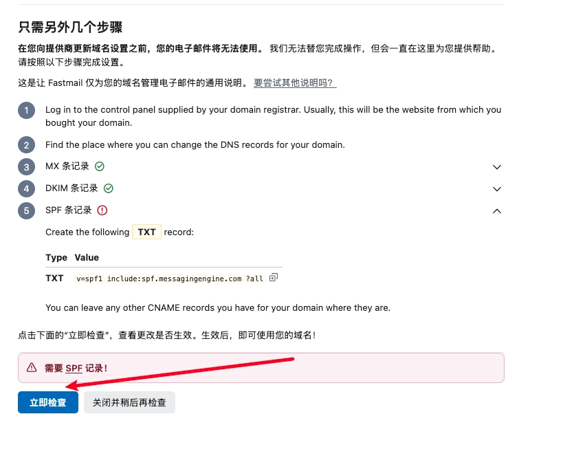 回到 Fastmail,点击左下角的 立即检查