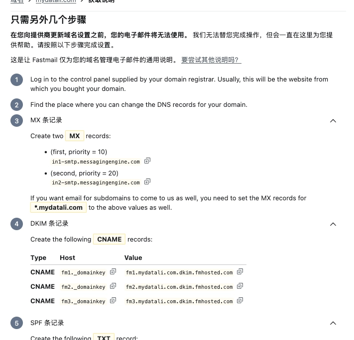 MX 记录的主要作用是用于接收邮件,可以理解为将这个域名邮箱的收件信息填写成 Fastmail,由 Fastmail 处理接收我们的邮件