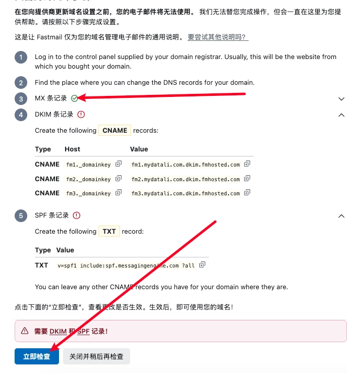 此时会提示还需要 DKIM 和 SPF 记录