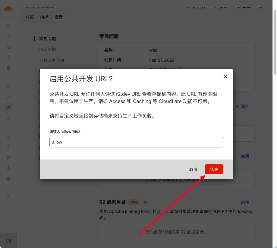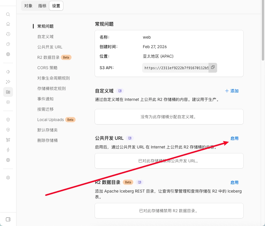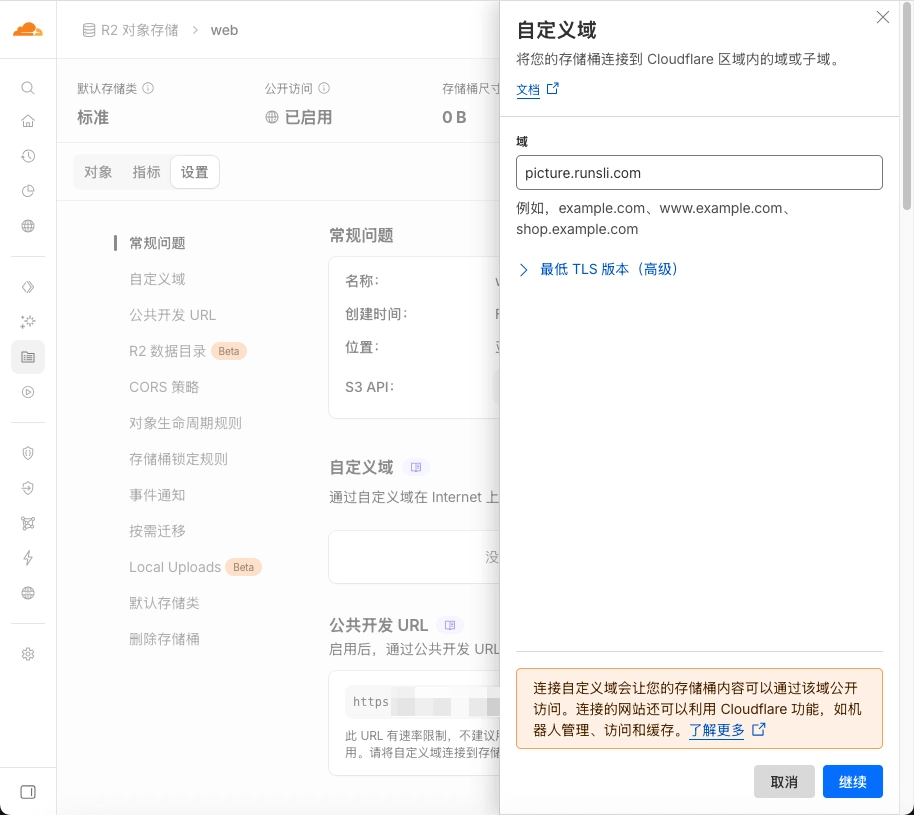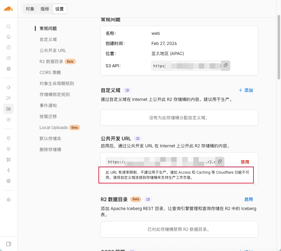Cloudflare 支持通过 r2.dev 子域名和自定义域名的方式进行访问,前者在 Cloudflare 称为公共开发 URL 。可以看到这里有一段文字说明就是说这个子域名可能访问效果不太好,所以我个人建议使用自定义域名