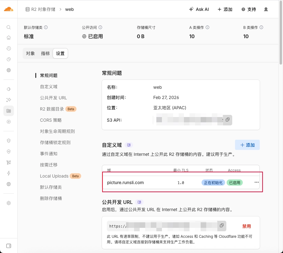 当看到下面的图片的时候,说明自定义域名已经设置好了。处于安全起见,建议大家一并同时关闭使用 r2.dev 子域名的访问权限