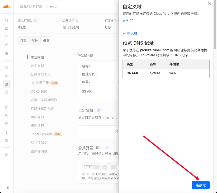 因为默认的 r2.dev 的域名与自定义域名相比,可能访问速度上有些许差异。所以下面我们来帮绑定一下自定义域名