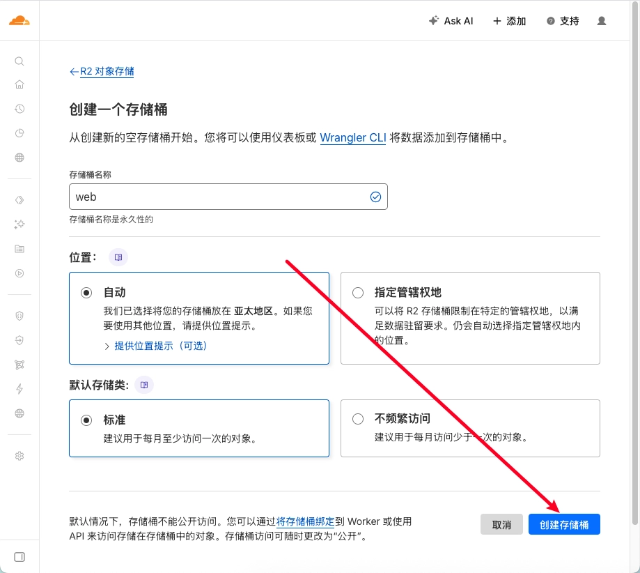 我在这里以 “web” 为例,下面的位置一般情况是亚太地区,默认存储类保持默认的标准就好